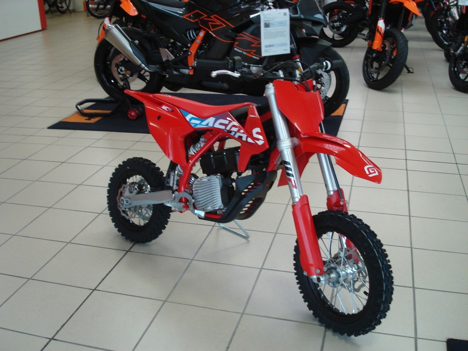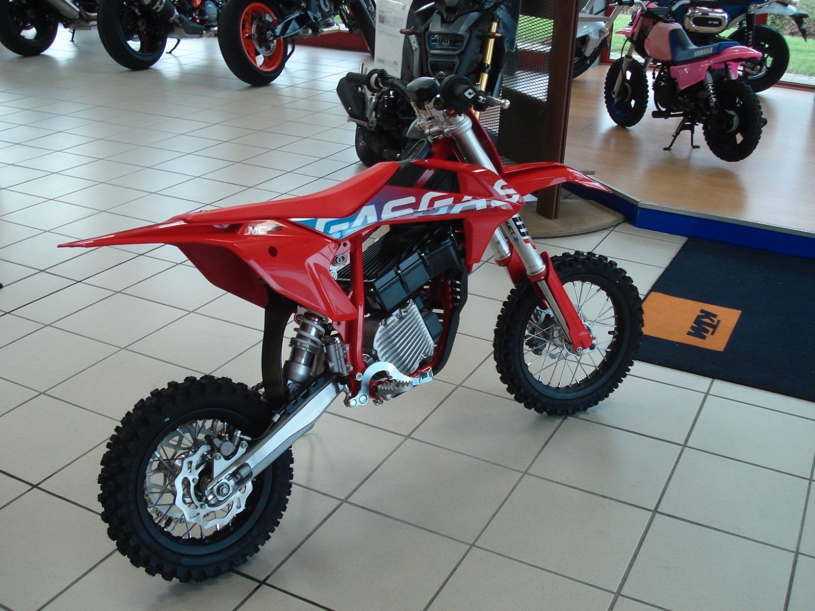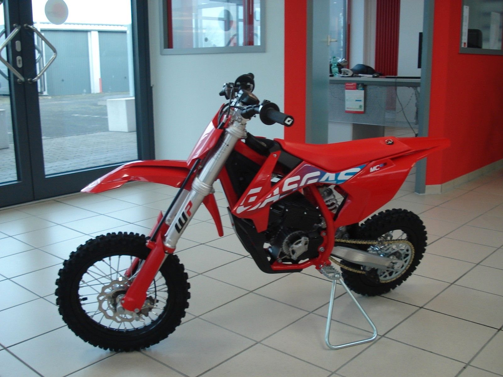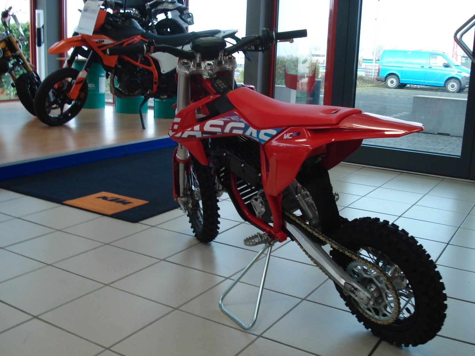 Für jüngste Nachwuchsfahrer ist ein besseres Dirtbike als die GASGAS MC-E 5 kaum zu finden! Diese batteriebetriebene rote Rakete im Miniformat ist ideal, um das Motorradfahren zu erlernen, und bietet gleichzeitig alles, was ein Rennfahrer braucht. Jetzt wassergekühlt für eine noch gleichmäßigere Leistung - für noch mehr und längeren Spaß! Auch der Rahmen ist neu. Speziell für die MC-E 5 entwickelt, macht das brandneue Fahrwerk das Bike viel komfortabler und deutlich einfacher zu fahren. So wie ihre großen Schwestern aus der GASGAS-Modellreihe ist sie mit MAXXIS-Reifen, NEKEN-Lenker, ODI-Griffen, einer einstellbaren WP-Federung sowie super coolen schwarzen Felgen ausgestattet, die ihr das gewisse Extra verleihen. Kurz gesagt, die MC-E 5 ist echt top. Egal ob für erste Geländeerfahrungen oder für die Jagd nach Meisterschaftstiteln - dieses Motocross-Bike ist der ideale Begleiter für junge Fahrer. Und wie sieht die MC-E 5 aus? Mit einigen blauen Farbtupfern in der Grafik, die für den elektrischen Antrieb stehen, setzt dieses Mini-Dirtbike sowohl auf als auch außerhalb der Rennstrecke ein starkes Statement. Und damit das auch so bleibt, wird die Grafik - wie bei den großen Bikes - mittels In-Mold-Verfahren aufgetragen. Das bedeutet, dass sie tatsächlich unter der Kunststoff-Oberfläche liegt und so nicht verkratzen oder abblättern kann. Ziemlich cool, oder? Damit der Fahrspaß länger anhält, wird der Motor der MC-E 5 jetzt mit einem neuen Kühlsystem wassergekühlt. So wird der kleine 5-kW-Motor innerhalb seines idealen Temperaturbereichs gehalten, weshalb es zu keinem Leistungsverlust kommt. Dank seines staub- und wasserresistenten Designs ist der Motor nahezu wartungsfrei. Das heißt: mehr Zeit zum Fahren und weniger Zeit in der Garage!